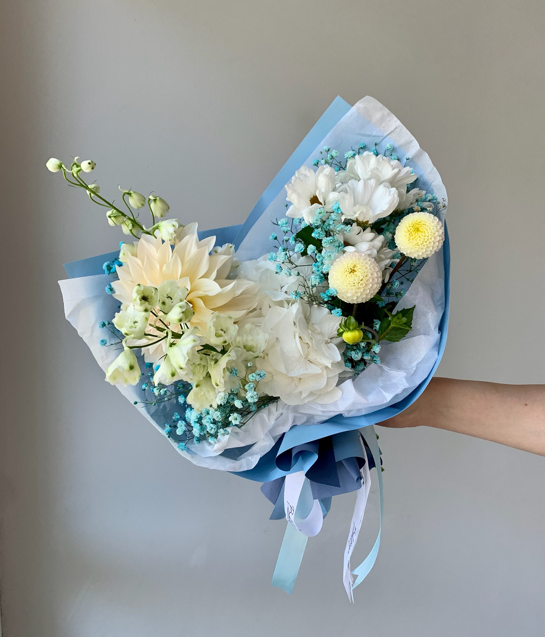 Свежий и воздушный букет в холодных оттенках словно наполнен дыханием моря и прохладой раннего утра. Его цветовая гамма напоминает о прозрачной морской воде, мягком тумане над берегом и лёгком ветре, скользящем по поверхности волн. Композиция навевает ощущение спокойствия и умиротворения, создавая атмосферу чистоты, гармонии и внутреннего баланса, будто вы на мгновение оказались у океана, вдали от суеты и шума повседневной жизни.